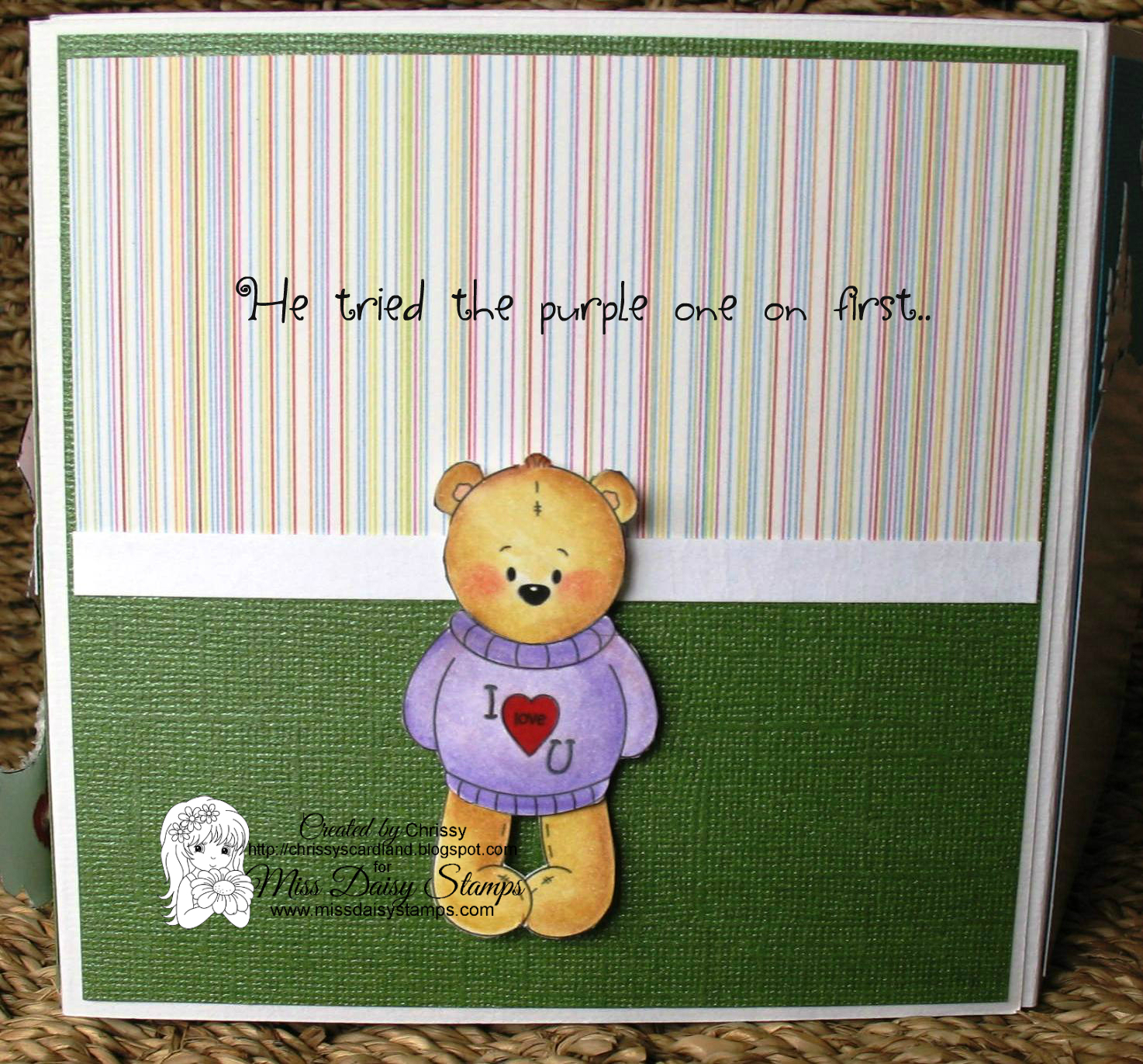 Fabulous job, Chrissy! Love, love, love it! I love teddy bears to start with, and here's an entire story with Little Bear! Incredible and beautiful. Love it all. Great message for the Grandma to pass along. I'm sure the child was delighted. Happy Stamping! Love, Miss Daisy